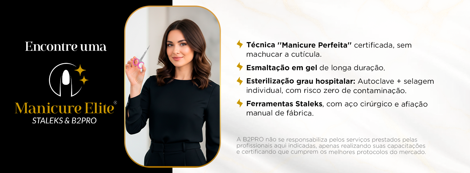 Nossas profissionais são expert em unhas naturais e dominam técnicas como: cuticulagem tradicional, cuticulagem com tesoura e brocas, (método Manicure Perfeita), esmaltação em gel, entre outras. Elas são oficialmente reconhecidas pela Staleks e pelo grupo B2PRO, referências em qualidade e segurança no mercado da beleza.